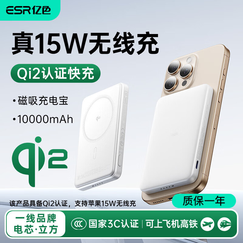 亿色【苹果15W丨3C认证】Qi2磁吸充电宝MagSafe15W无线快充10000/5000毫安可上飞机移动电源适用苹果17 典雅白丨1万毫安【3C认证】 Qi2认证丨真15W无线快充