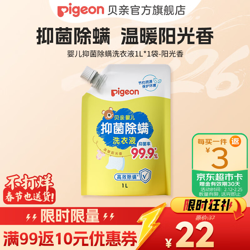 贝亲婴儿洗衣液婴幼儿 儿童洗衣液 宝宝洗衣液 99.9%抑菌 温暖阳光香1L-袋装