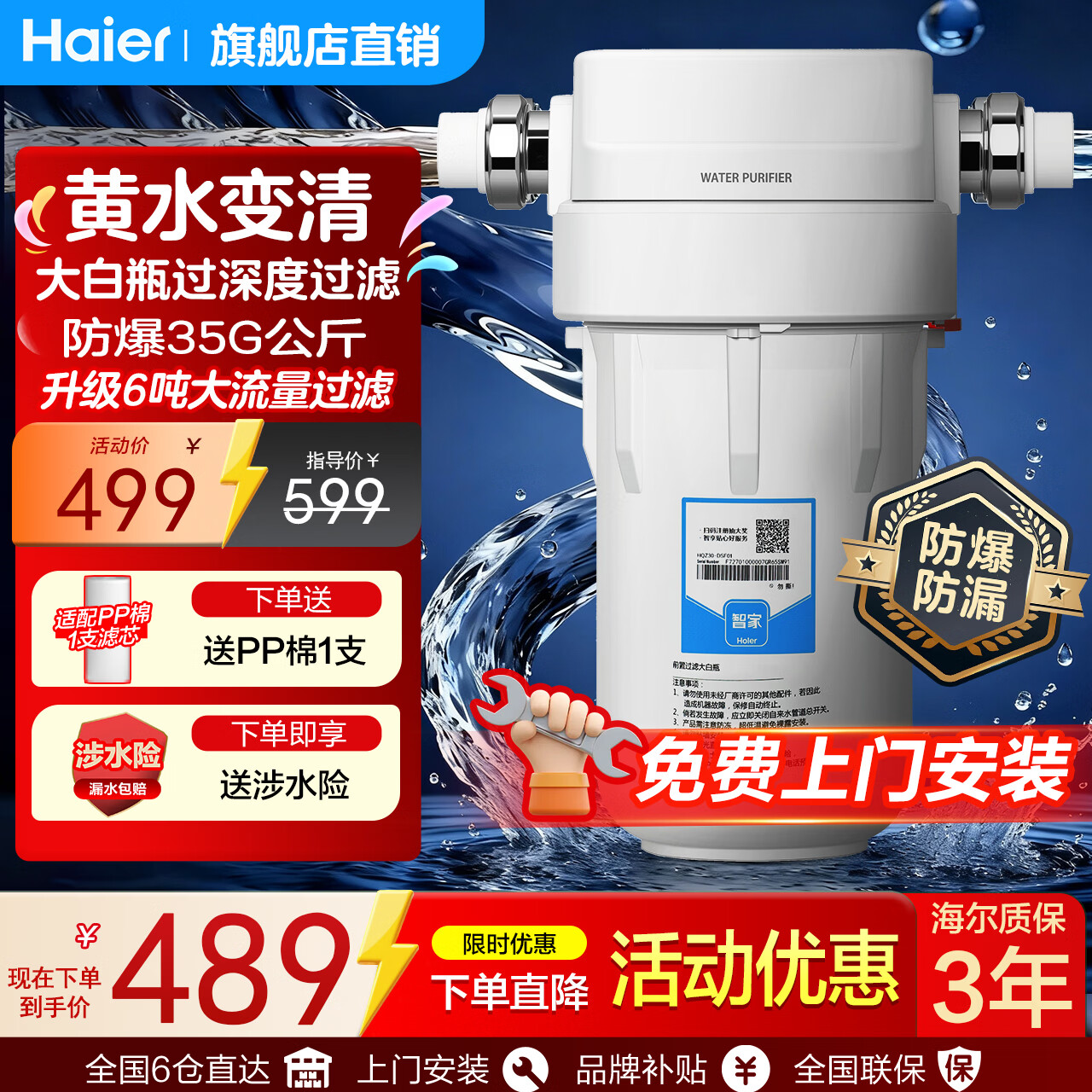 海尔大白瓶前置过滤器家用全屋管道入户自来水过滤大流量净水器防爆滤瓶通用10寸芯中央净水包安装 大白瓶