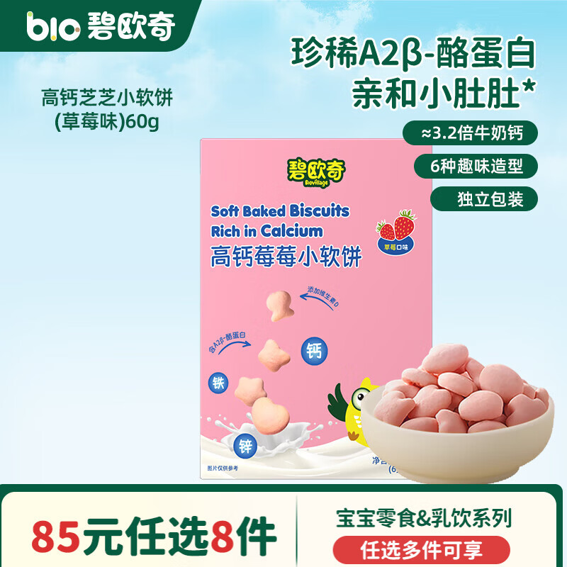 碧欧奇婴幼儿宝宝儿童零食乳饮集合 高钙小软饼-草莓味60g