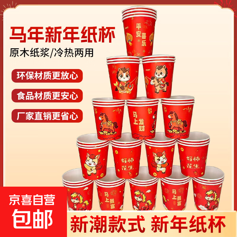 2026马年纸杯新年元旦一次性杯子红色喜庆加厚纸杯家用水杯不漏水 新年纸杯 50只