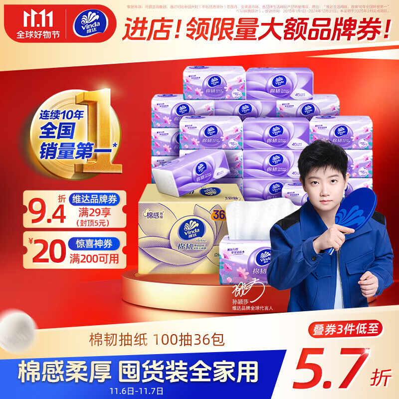 维达(Vinda)抽纸【孙颖莎推荐】棉韧3层100抽*36包S码 亲肤无刺激 纸巾 整箱