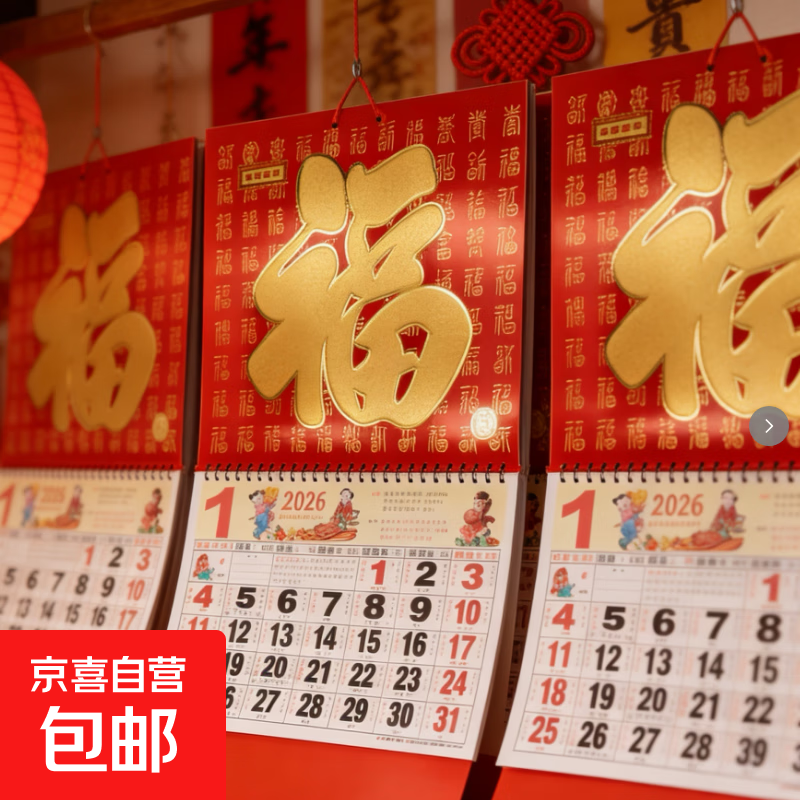 挂历2026年新款马年福字家用挂墙吊牌中国风福字金箔挂历中国红 六开百福满堂