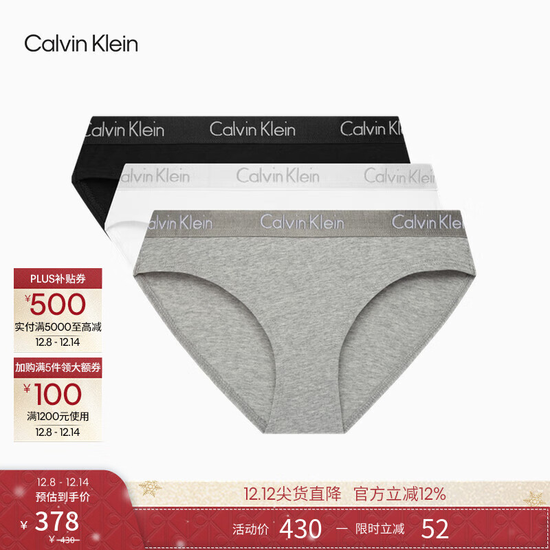 Calvin Klein内衣女士三条装经典提花腰边ck舒适棉质微弹性感比基尼三角内裤女 MP1-太空黑/椰青灰/月光白 3条 S 尺码偏大,建议拍小一码