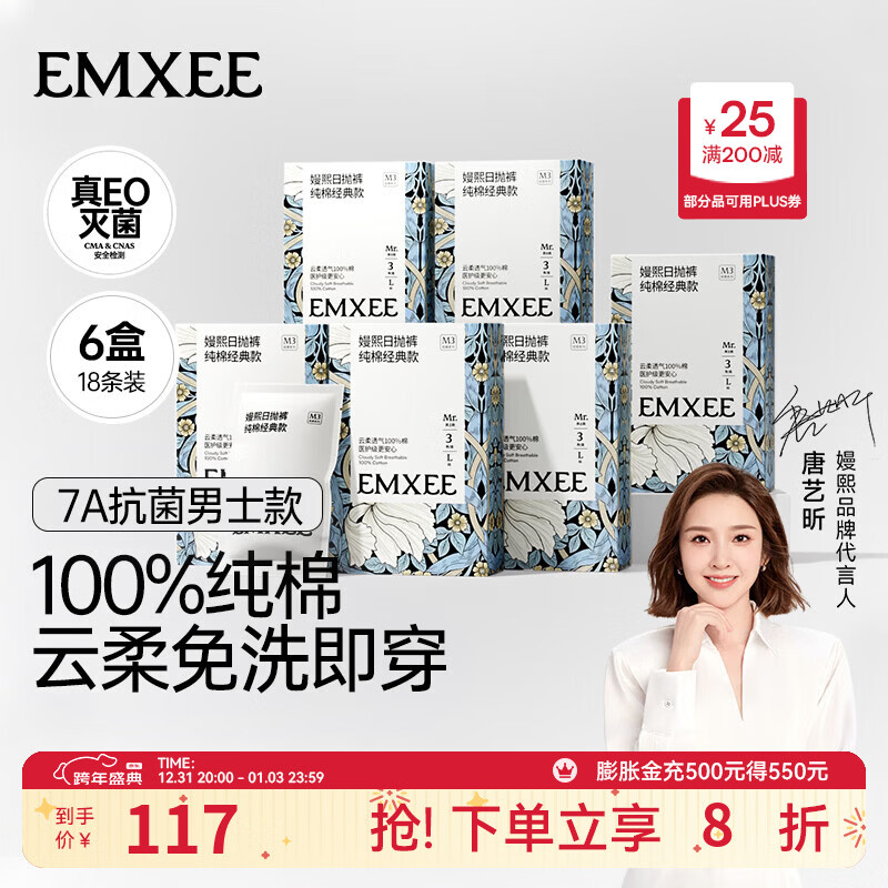 嫚熙(EMXEE)E3一次性内裤平角全棉纯棉短裤四角旅行成人免洗男士内裤大码 7A抗菌100%纯棉【男士款 18条】 XXL 建议150-170斤