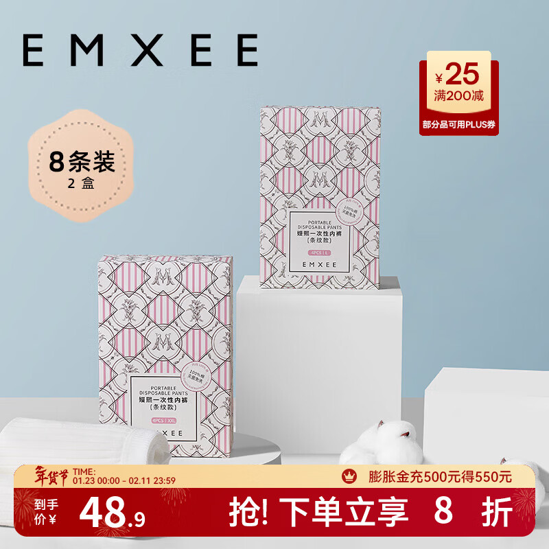 嫚熙(EMXEE)一次性内裤纯棉无菌旅行短裤产妇月子女士出差日抛免洗条纹款 2盒共8条 XL(建议100-120斤)