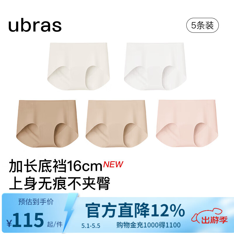 ubras母亲节礼物【加长底裆】无尺码无痕内裤女士运动瑜伽防尴尬不夹臀 【蔓越莓底裆】隐形肤+瓷肌+奶油杏+燕麦奶+白 5条 均码 90-130斤