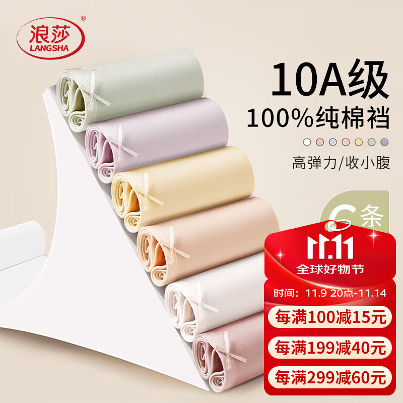 浪莎女士内裤女纯棉10A抑菌裆舒适透气中腰大码少女三角裤短裤头6条装