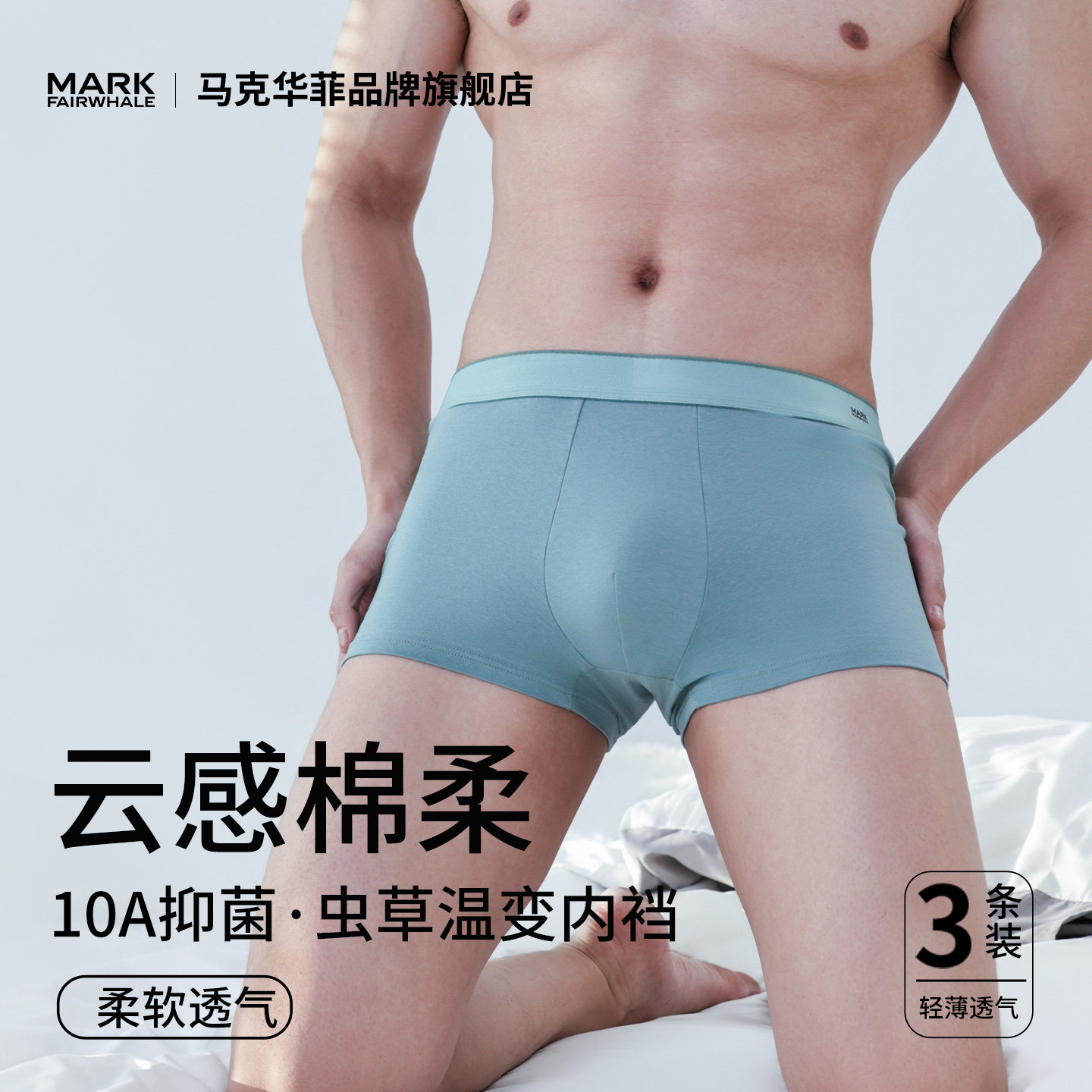 马克华菲男士纯棉10A抗菌平角内裤虫草温变平角裤3条装吸汗透气