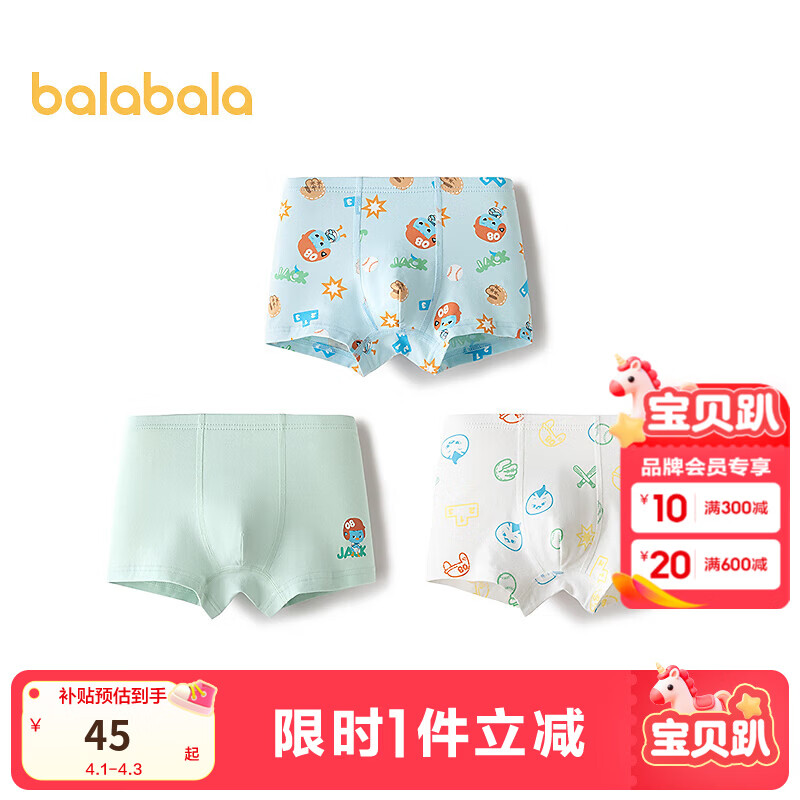 巴拉巴拉【萌鸡小队IP】男童内裤棉平角四角短裤抗菌不夹P三条装 蓝绿色调00384 110