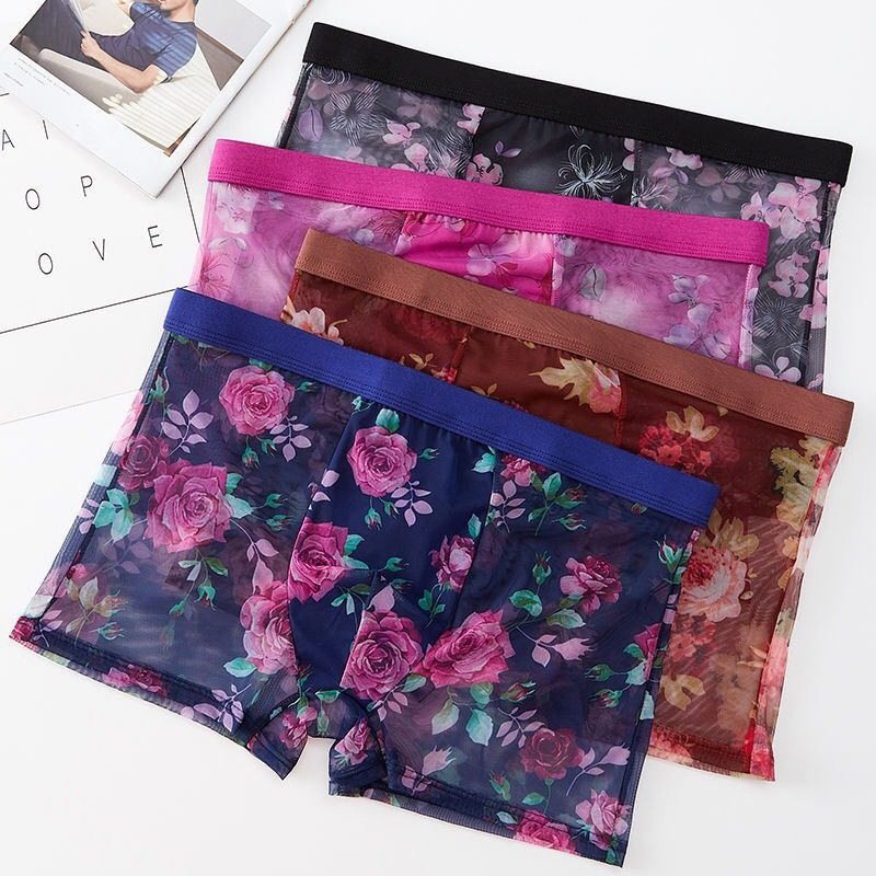 男士印花卉网纱平角内裤冰丝感透气舒适超薄全透明骚四角短裤头夏