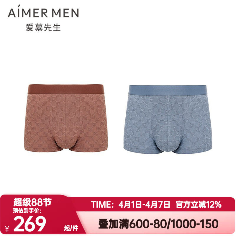 2条装 爱慕先生正品沁凉肌理内裤男士格纹提花装腰平角裤NS23N331