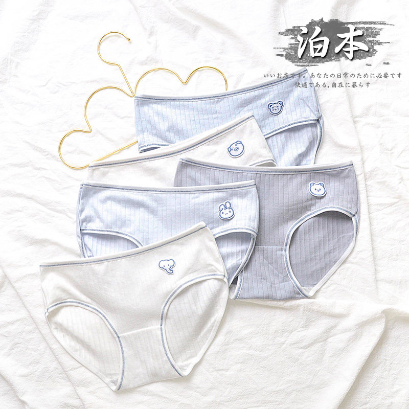 外贸款纯棉小动物绣标女士三角内裤清新纯色日系简约底裤女坑条棉