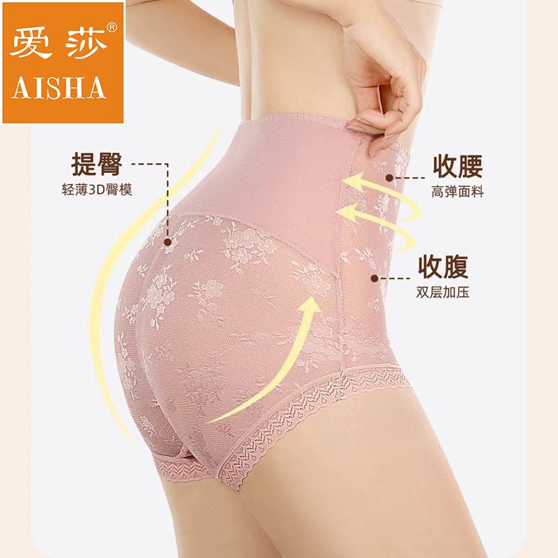 爱莎女士平角高腰提臀收束腰底裤100%棉质裤裆女式内裤提花纱蕾丝