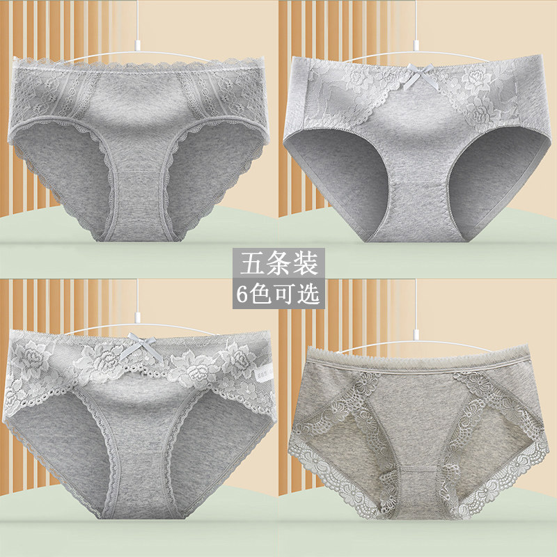 新款极简风灰色纯棉中腰内裤女轻柔舒适无感蕾丝花边女士三角裤