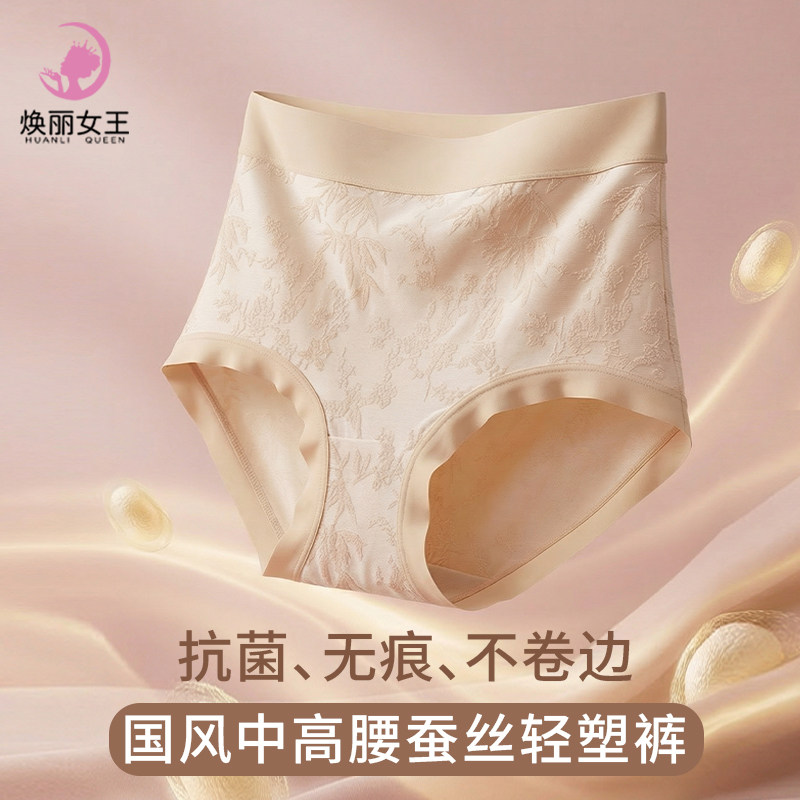 焕丽女王新中式浮雕绣花高腰桑蚕丝底裆全包臀三角女士无痕内裤女