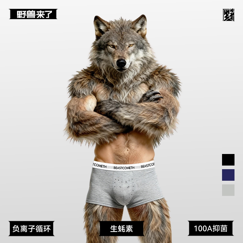 野兽来了唤醒野兽宽松透气100A抗菌男士内裤按摩颗粒生蚝素平角裤