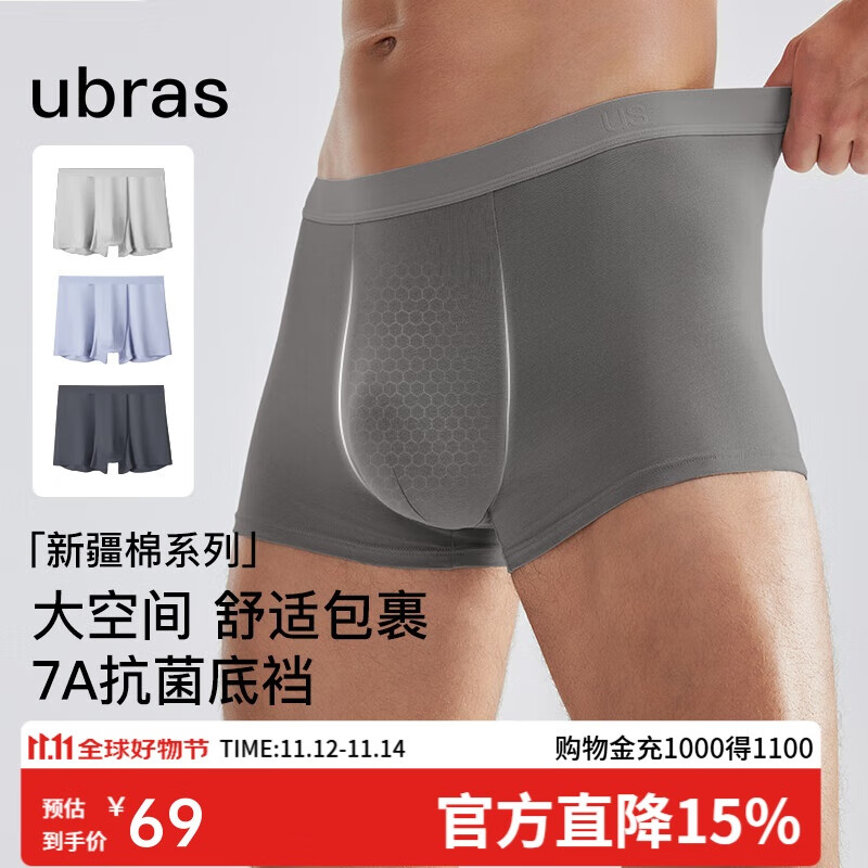 ubras【纯棉】透气网眼男士内裤男中腰四角裤3条装 蓝+灰+鸽羽灰L