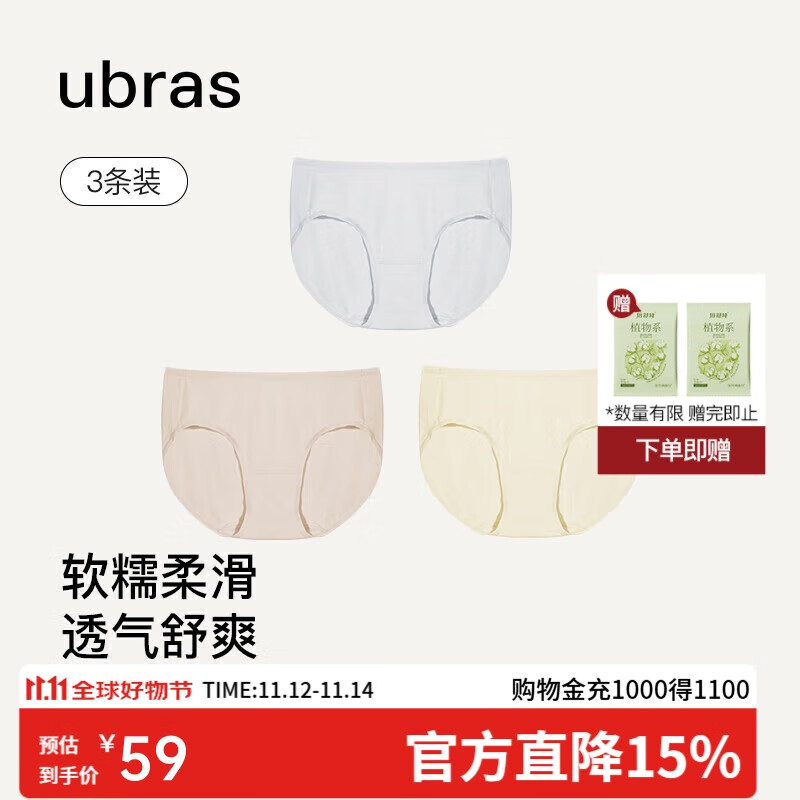 ubras高弹织带莫代尔7A抗菌裆中腰三角裤女士内裤女3条装 灰+瓷肌+黄 M