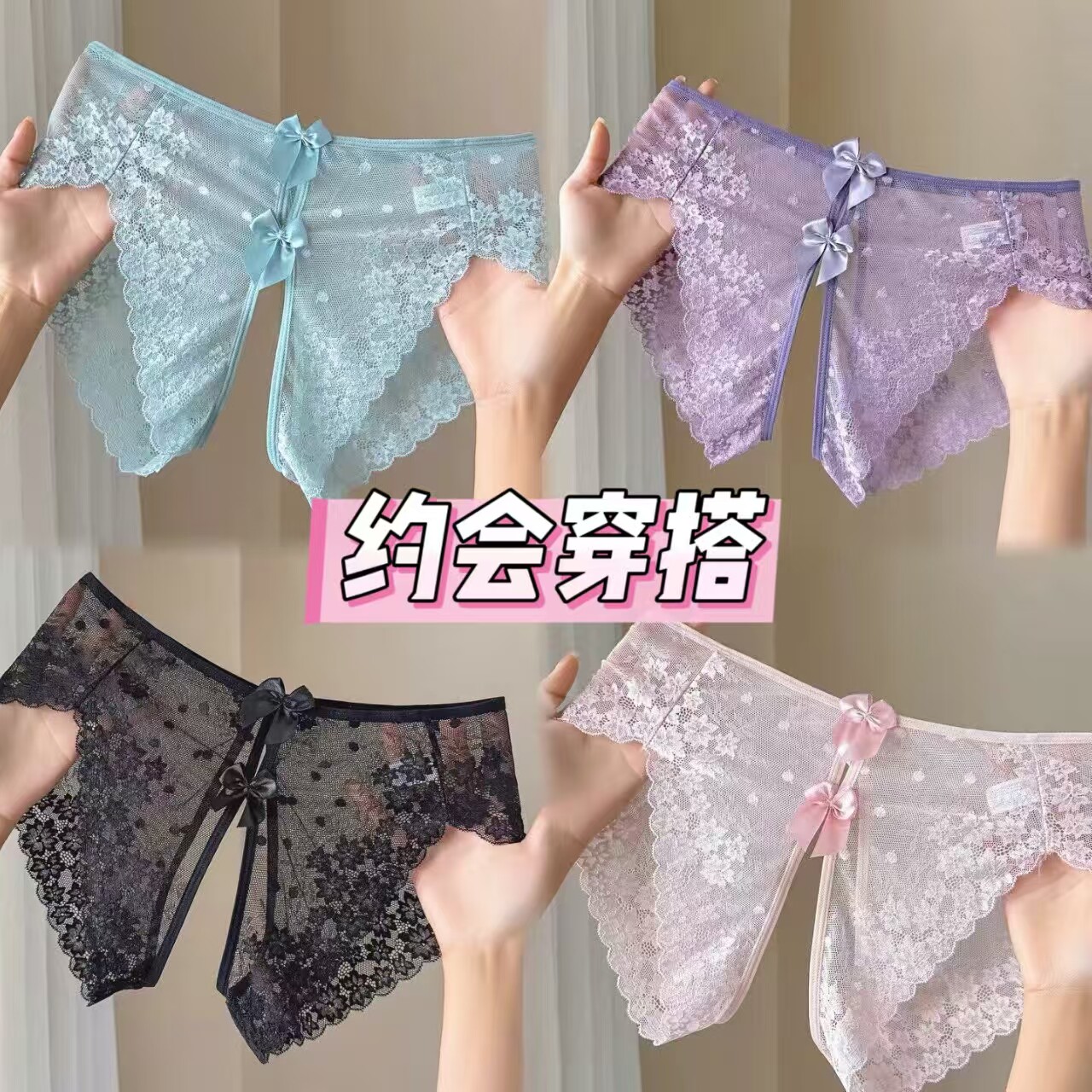 蕾丝法式纯欲透明少女内裤中腰蝴蝶结缎面纯棉档内裤女薄款夏季