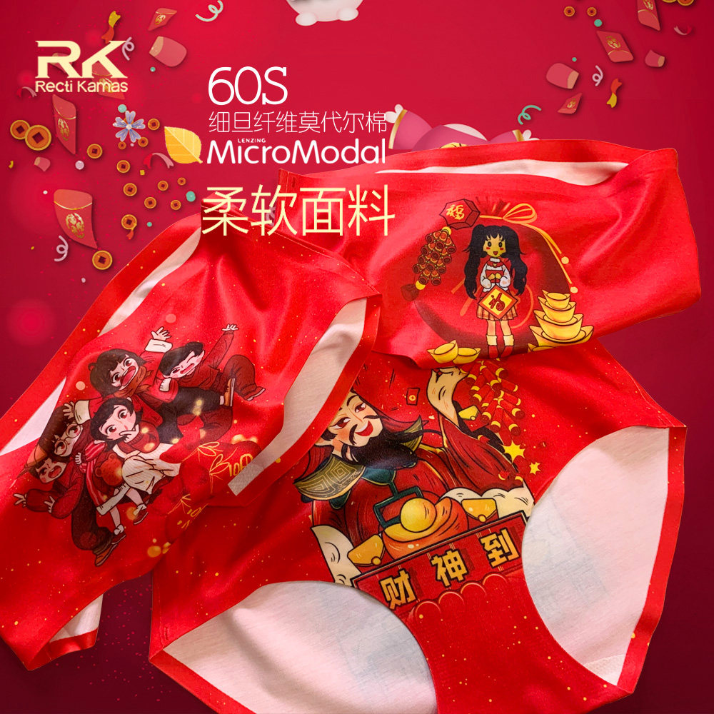 RK红色本命年财神鸿运红色无痕内裤个性无感印花莫代尔棉中腰三角