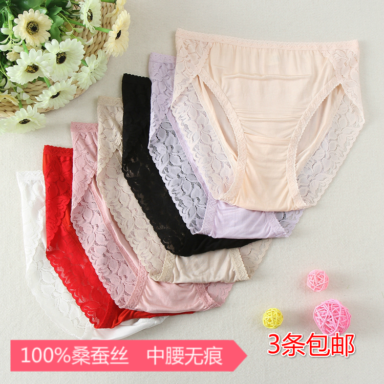 柔软细腻女舒适中腰100%桑蚕丝蕾丝花边针织真丝三角内裤无痕短裤