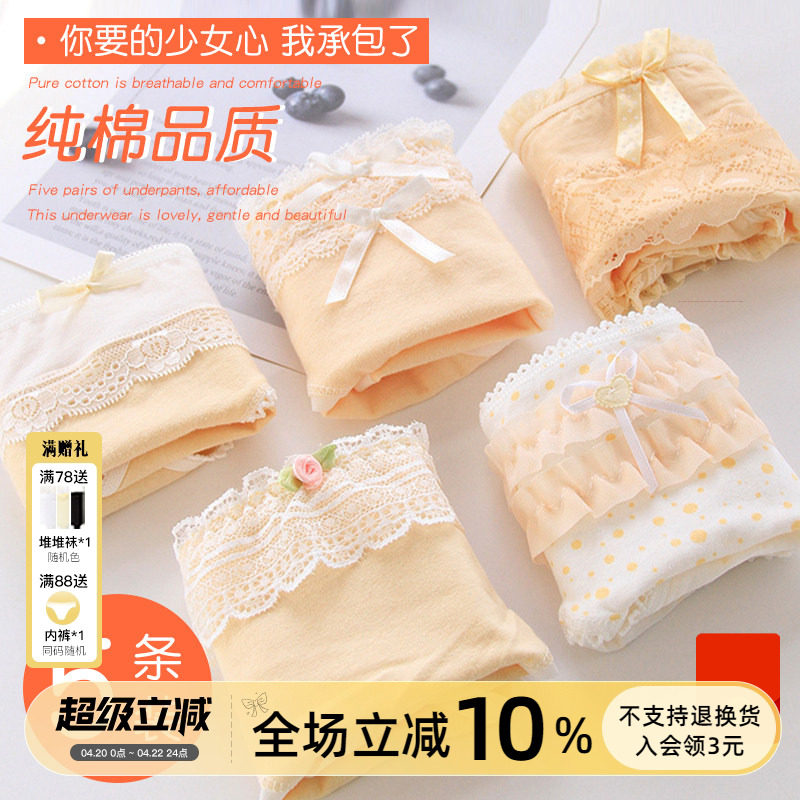 5条纯棉内裤少女蕾丝边日系可爱蝴蝶结全棉裆中腰大码女士三角裤
