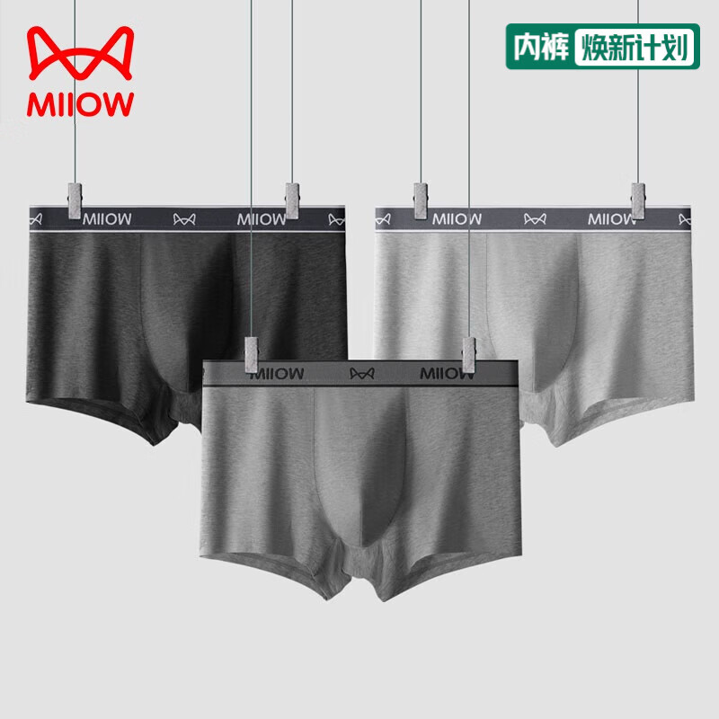 猫人3条装男士全棉内裤7A级抑菌裆中腰男式四角裤u凸短裤头宽腰内裤 黑麻灰+深麻灰+中麻灰 XL (110-130斤)