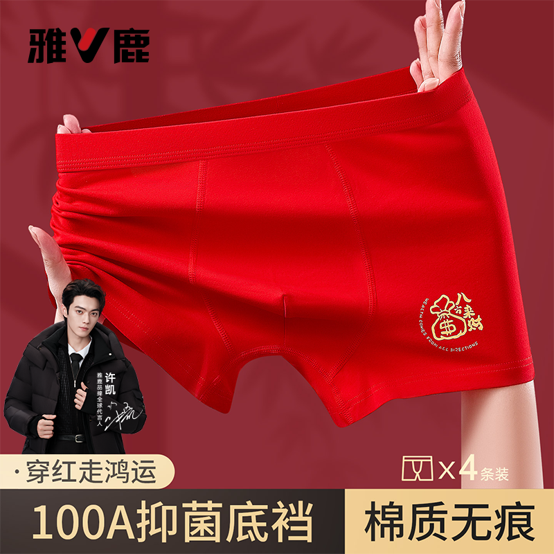 雅鹿本命年男士内裤红色纯棉抗菌裆2026属马年结婚男四角平角短裤