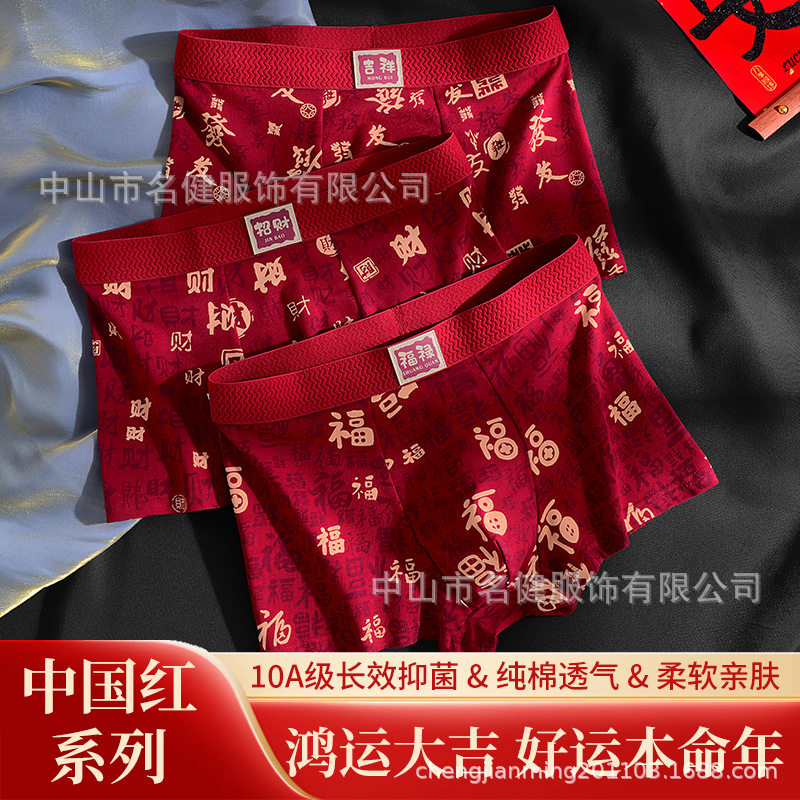 马年男士内裤大红纯棉红色内裤结婚喜庆抑菌好寓意文字印花平角裤