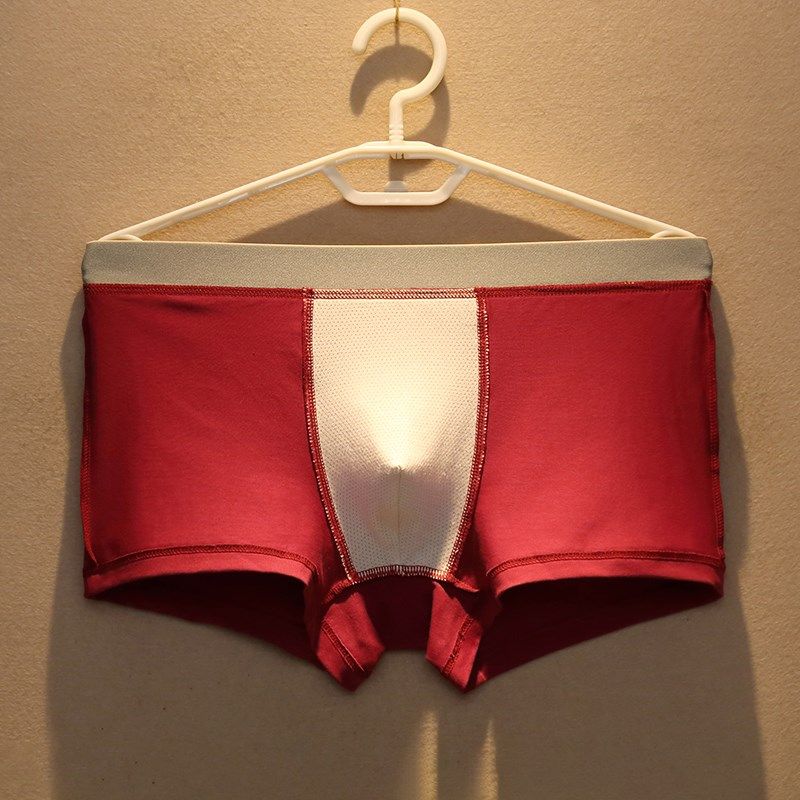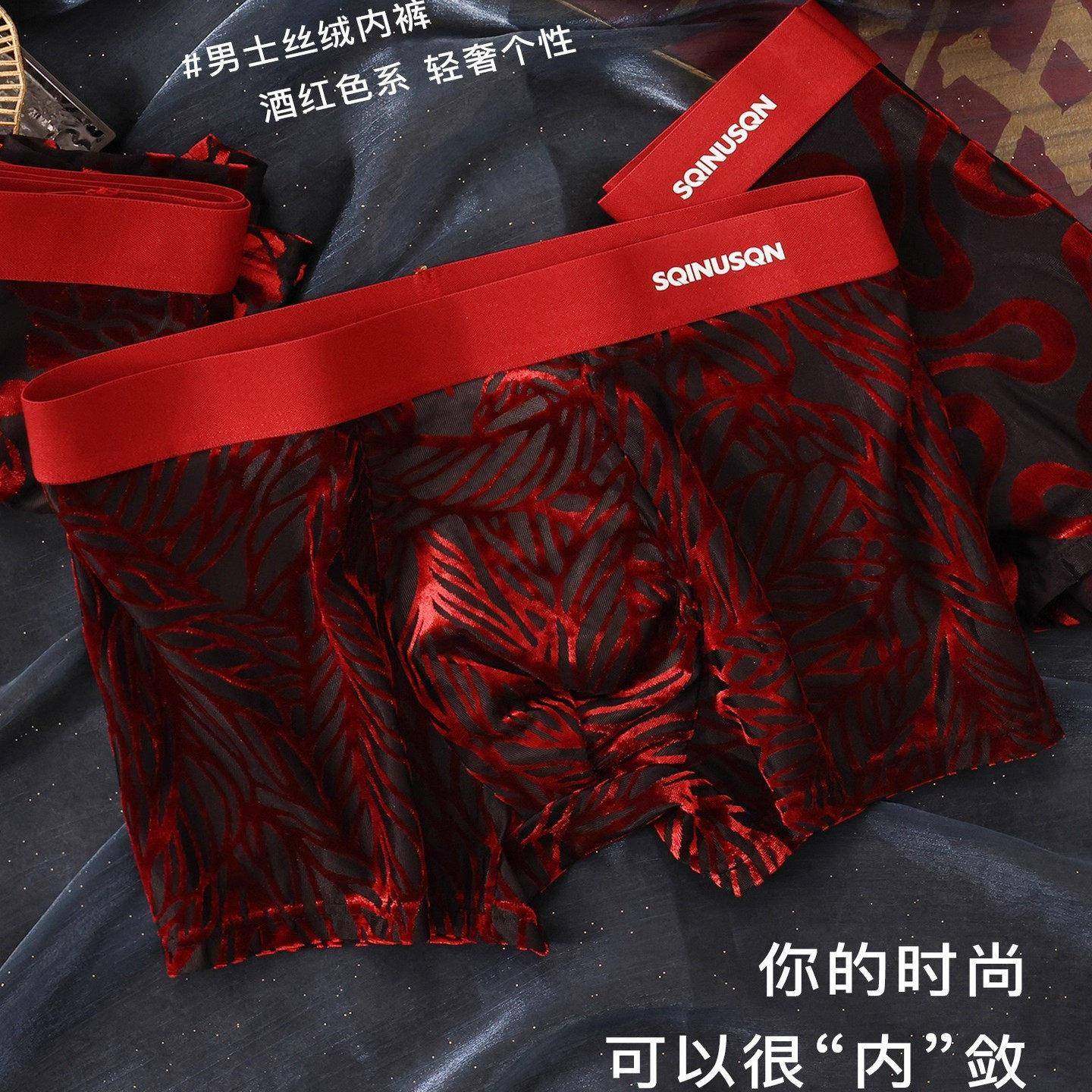 抗菌透气丝绒性感网纱四角裤衩酒红色本命年男士内裤底裤结婚喜庆