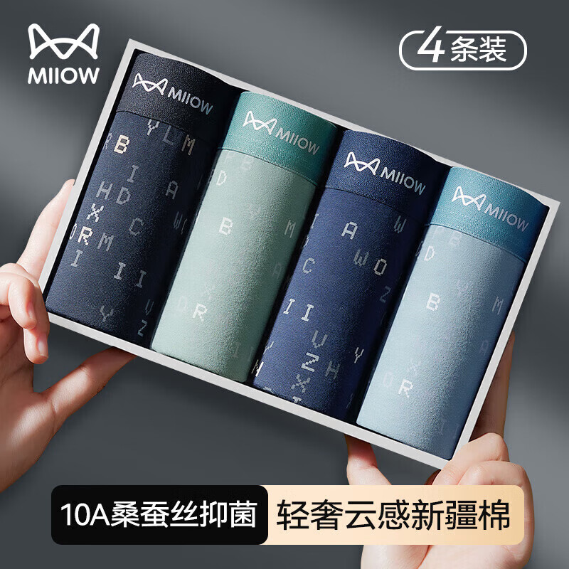 猫人商务纯棉男士内裤男10A抑菌平角裤短裤衩印花桑蚕丝内档新品4条装