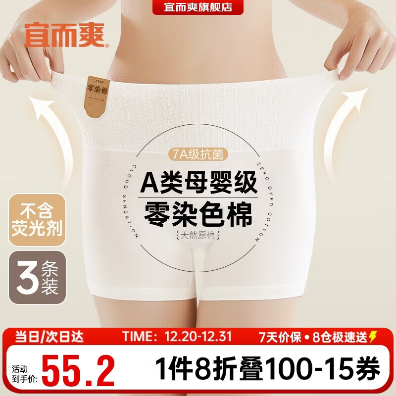 宜而爽【A类0染色棉无荧光剂】内裤女士高腰收腹纯棉平角安全7A抗菌3条