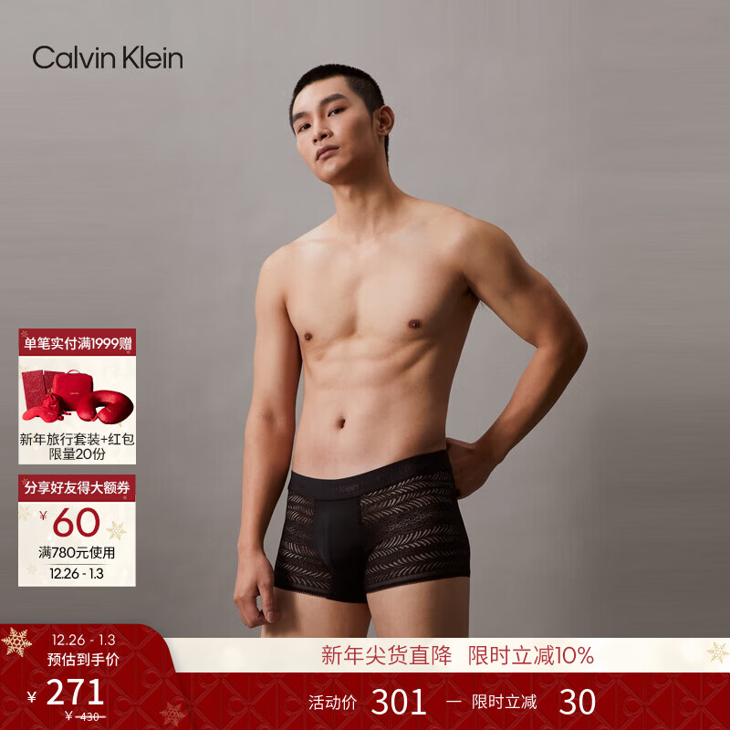 Calvin Klein内衣男士ck性感镂空蕾丝低腰轻薄透气顺滑防夹臀四角裤平角内裤 UB1-太空黑 1条 XL