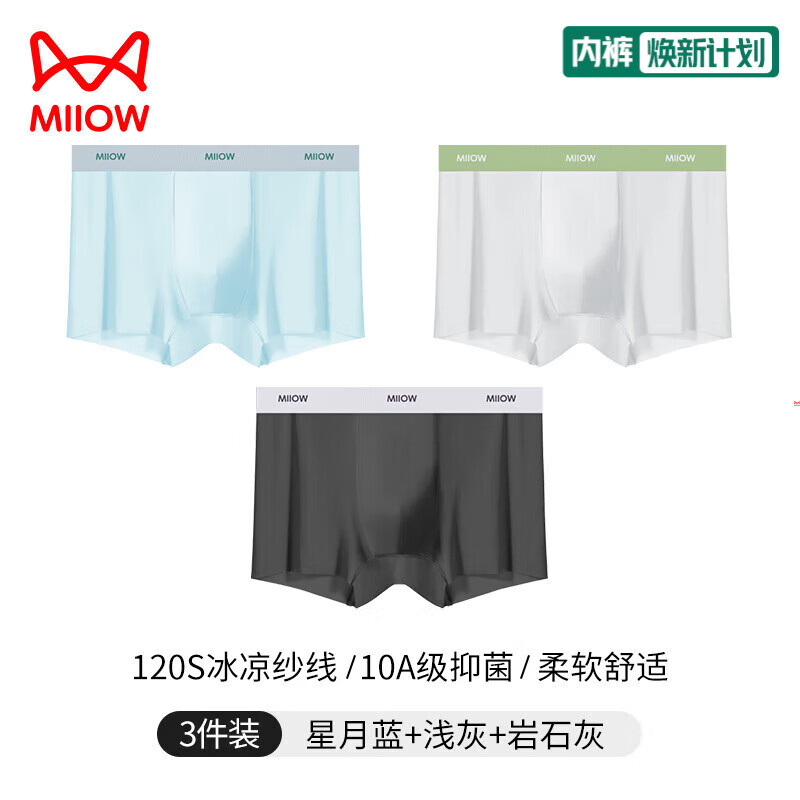 猫人男士冰丝无痕内裤夏季2026新款抑菌平角裤男生透气凉感四角短裤衩 星月蓝+浅灰+岩石灰 3条 4XL 【建议160-185斤】