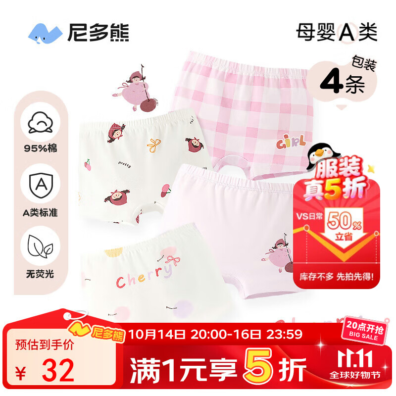尼多熊儿童内裤女童A类平角内裤宝宝纯棉婴儿四角短裤中小童不夹PP TB1635+TB1637(40支) 4条 120 (M) 【建议体重25-34斤】