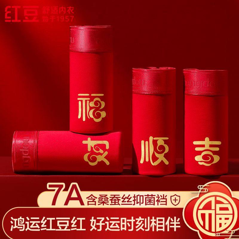 4条装 红豆男士大红色本命年含桑蚕丝抑菌平角内裤中腰四角短裤头