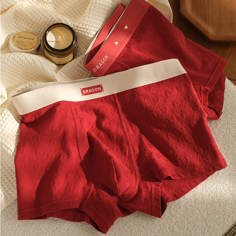 大红色男士内裤男款新年纯棉男生中腰四角裤头本命年爱心平角短裤