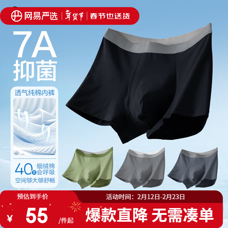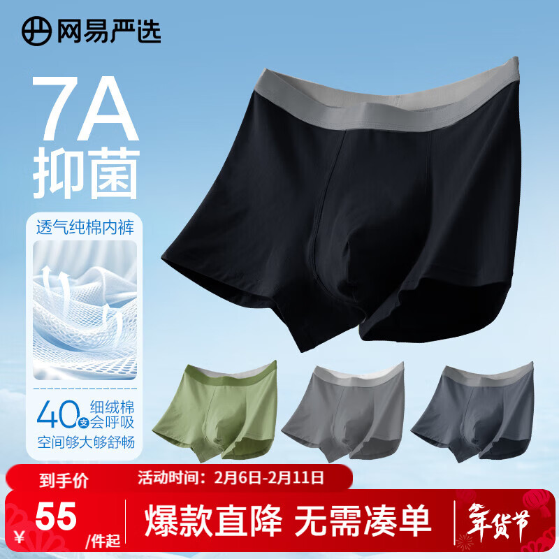 网易严选 男式7A全裤抑菌棉质透气平角男士内裤高弹舒适 A款7A抑菌-黑色+深灰+深绿+浅灰 4条 2XL