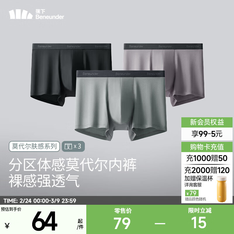 蕉下(beneunder)莫代尔男士内裤3条装无痕底裆抗菌冰丝平角裤透气运动四角裤 月凝灰+漫暮黑+薄烟紫 3条 XL