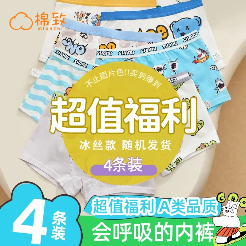 棉致儿童内裤1男童女童纯棉四角裤3小男孩学生宝宝5-10岁全棉平角短裤 (冰丝超值清仓)4条装男童 140 XXL码 48-60斤