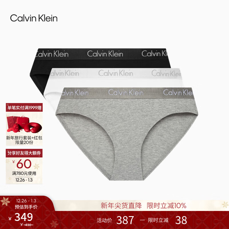 Calvin Klein内衣女士三条装经典提花腰边ck舒适棉质微弹性感比基尼三角内裤女 MP1-太空黑/椰青灰/月光白 3条 XS