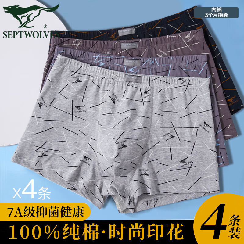 七匹狼7A抑菌男士内裤男纯棉100%棉平角裤中腰印花全棉裤衩短裤头四角裤