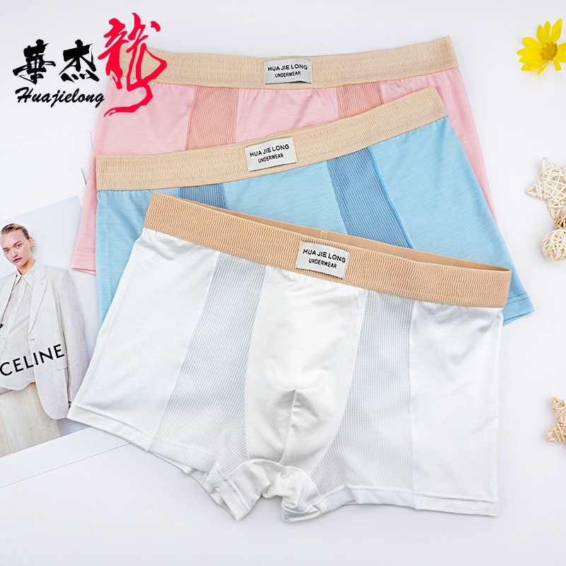 新款华杰龙纯色拼网孔男士内裤男平角裤透气潮中腰大码四角裤