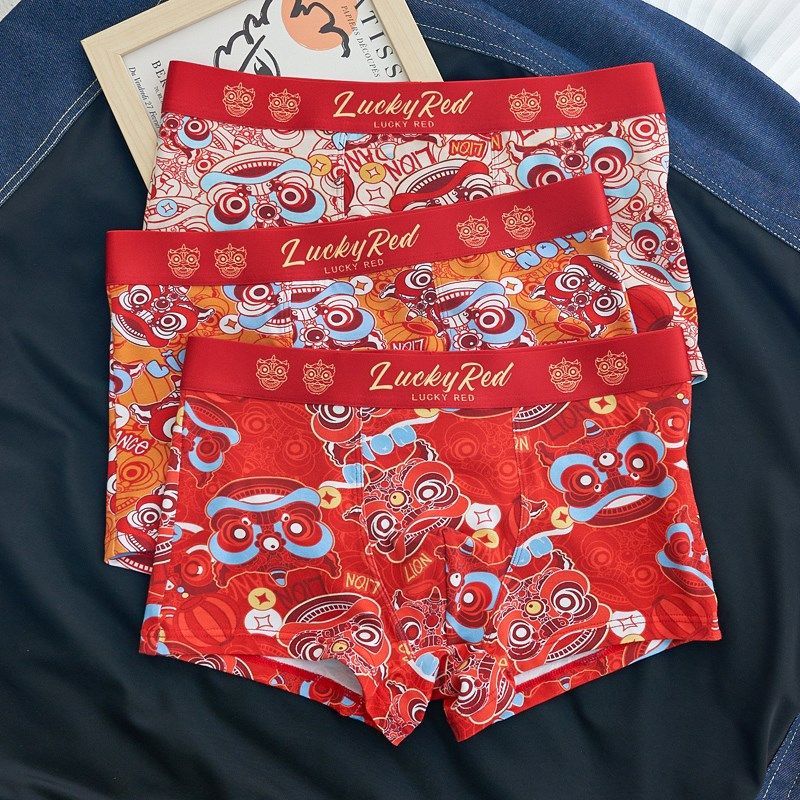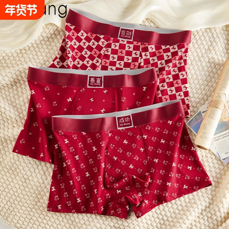 科将新款本命年男士内裤纯棉马年酒红色印花抑菌平角内裤透气