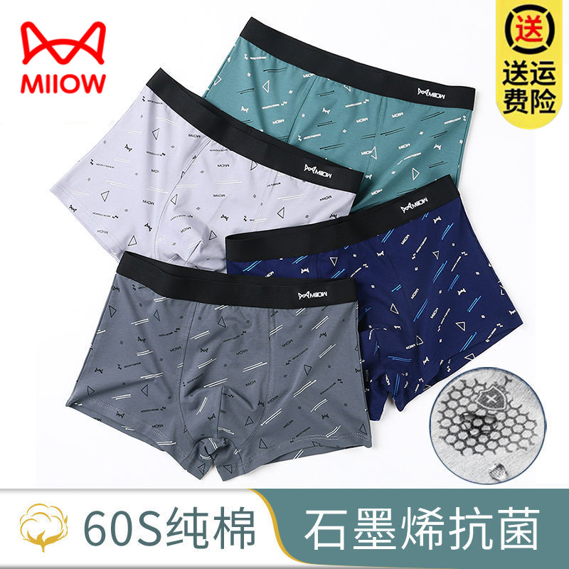 猫人正品男士内裤印花纯棉石墨烯抗菌平角男中腰运动透气四角短裤