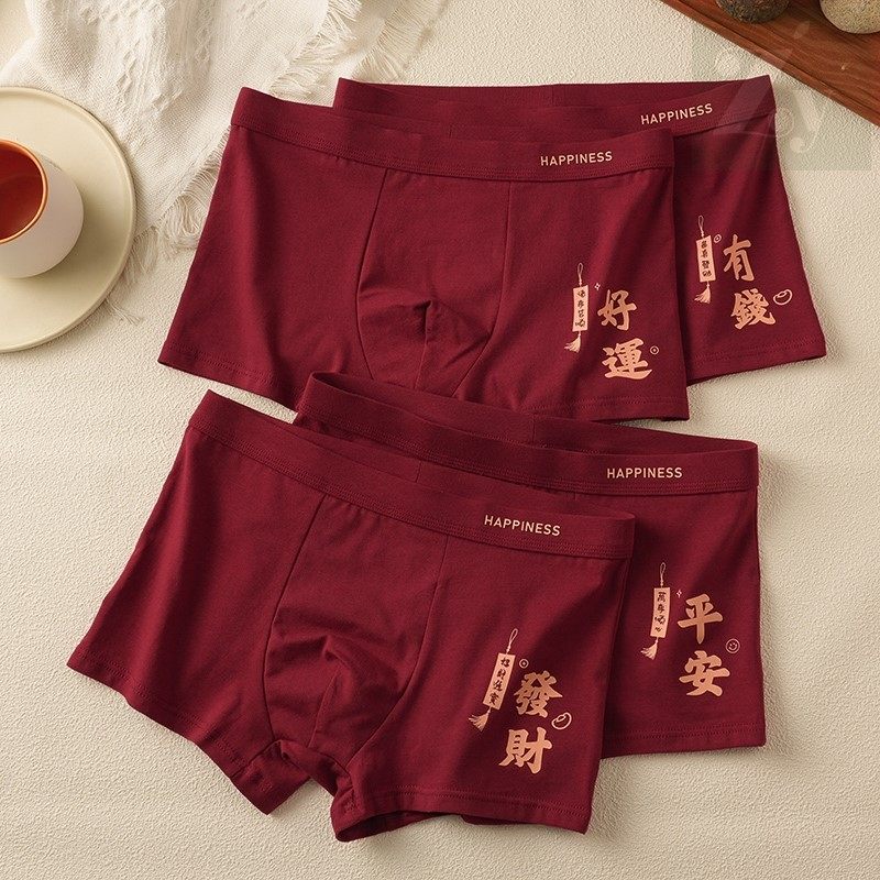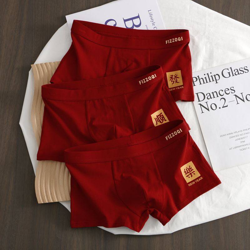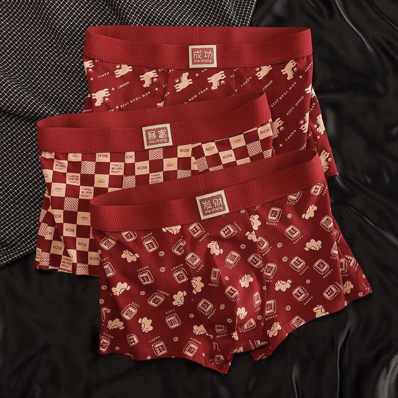 2026本命年男士内裤纯棉透气平角裤青年结婚酒红喜庆四角好运短裤