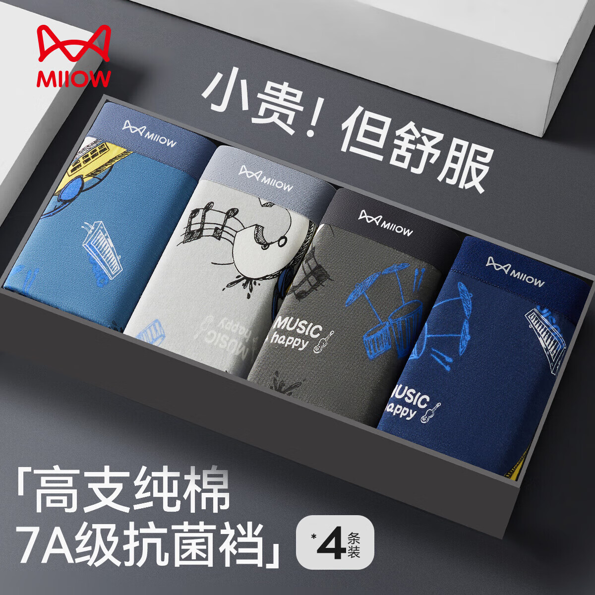 猫人【潮流印花】男士内裤纯棉7A级抑菌男款平角短裤四角裤4条装