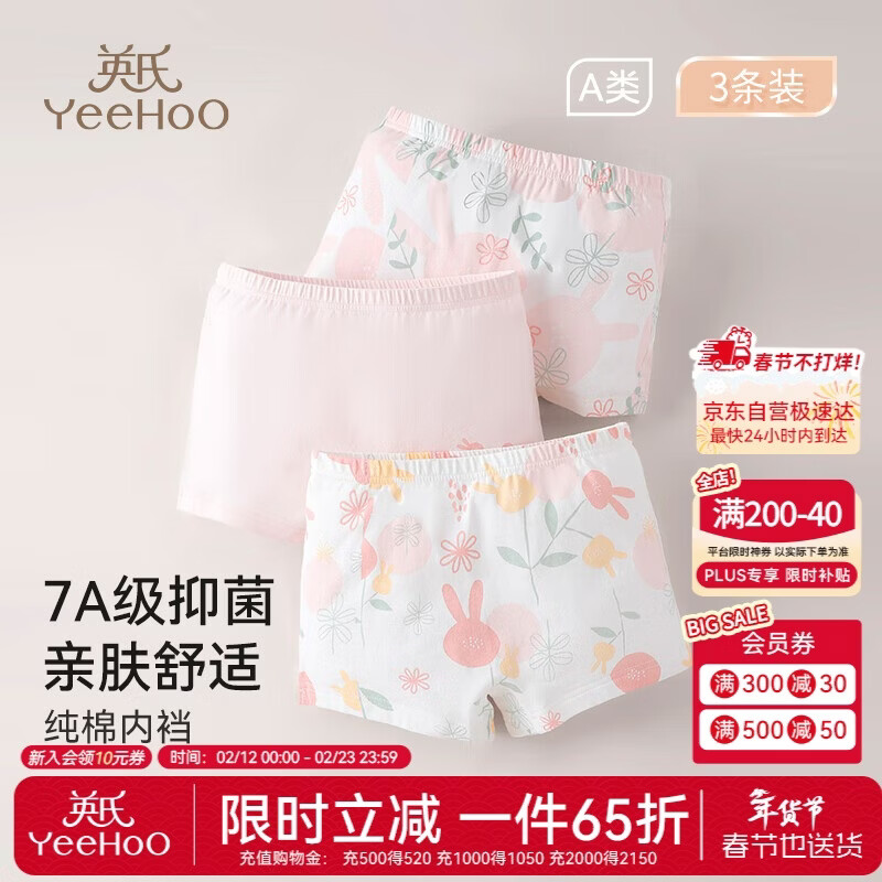 英氏(YEEHOO)【7A抑菌】单向导湿儿童内裤女童内裤纯棉宝宝平角内裤3-6岁