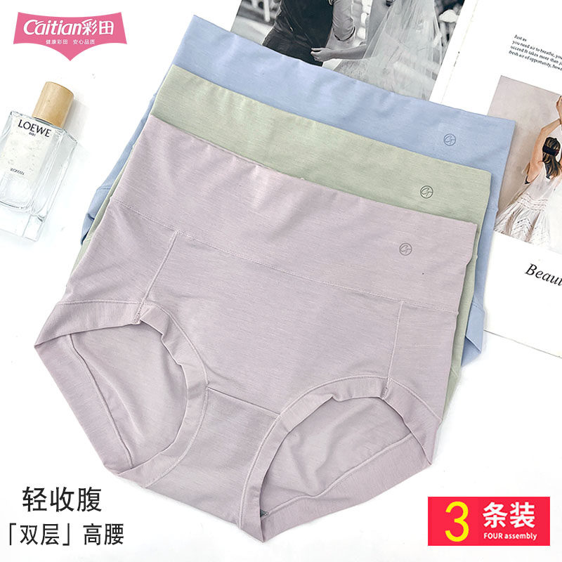 3条装正品彩田高腰收腹裤纯棉纯色柔软透气修身提臀女士平角内裤